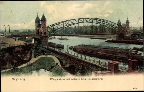 Ak Magdeburg an der Elbe, Königsbrücke mit Anlagen beim Preussenturm, Schiffe