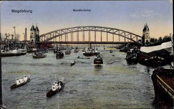 Ak Magdeburg an der Elbe, Nordbrücke, Ruderboote, Dampfschiff