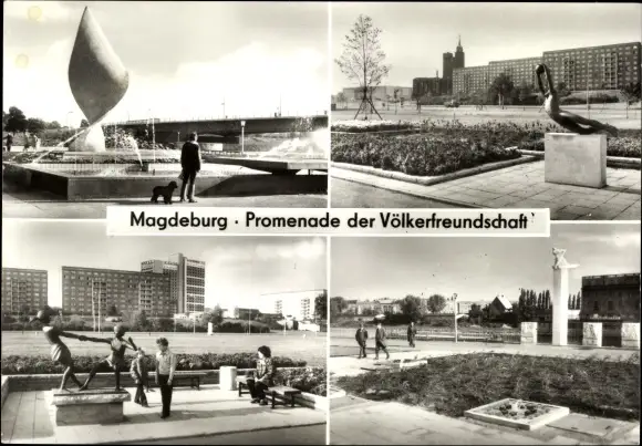 Ak Magdeburg an der Elbe, Promenade der Völkerfreundschaft, Brunnen, Statuen