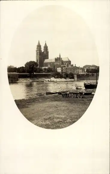 Ak Magdeburg an der Elbe, Teilansicht, Ufer, Kirche