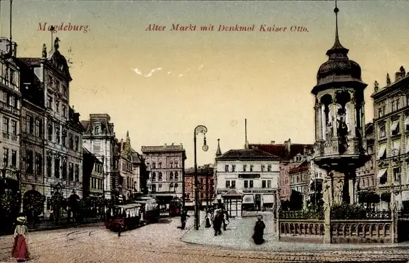 Ak Magdeburg an der Elbe, alter Markt, Denkmal Kaiser Otto, Straßenbahn