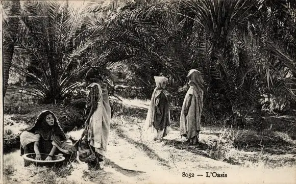 Ak Maghreb, Arabische Tracht, Oase, Palmen, Kinder