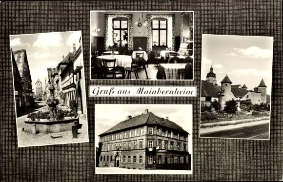 Ak Mainbernheim in Unterfranken, Gasthof zum Löwen, Speiseraum, Burg, Springbrunnen