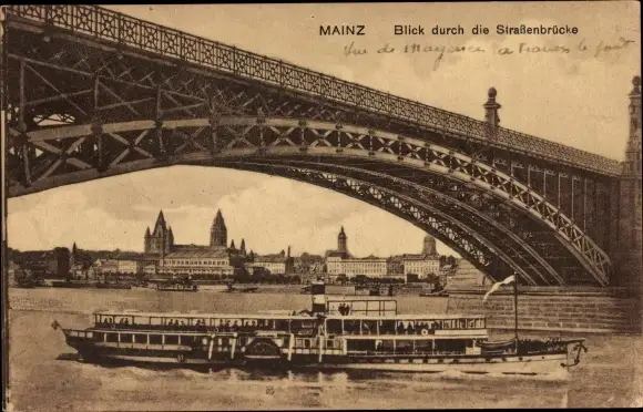 Ak Mainz am Rhein, Blick durch die Straßenbrücke, Rheinpartie, Raddampfer