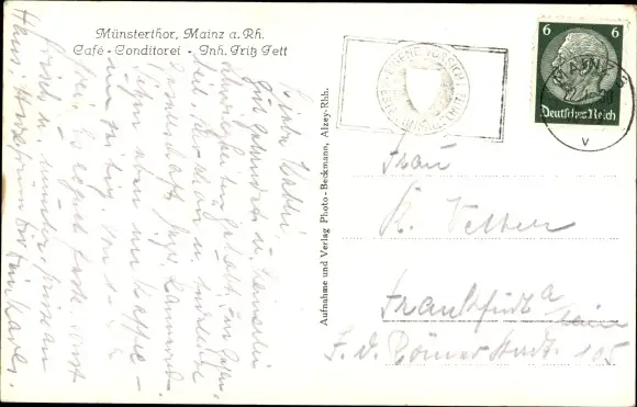 Zustand, siehe Scan, gelaufen, 1938- Inh. Fritz Fett - ca 15 cm X 9 cm