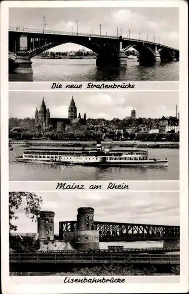 Ak Mainz am Rhein, Die neue Straßenbrücke, Eisenbahnbrücke, Uferansicht, Dampfer
