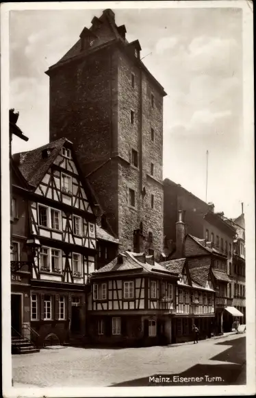 Ak Mainz am Rhein, Eiserner Turm, Fachwerkhäuser