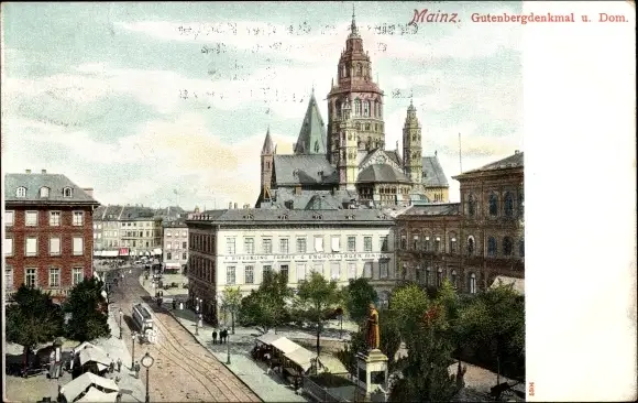 Ak Mainz am Rhein, Gutenbergdenkmal und Dom, Straßenbahn