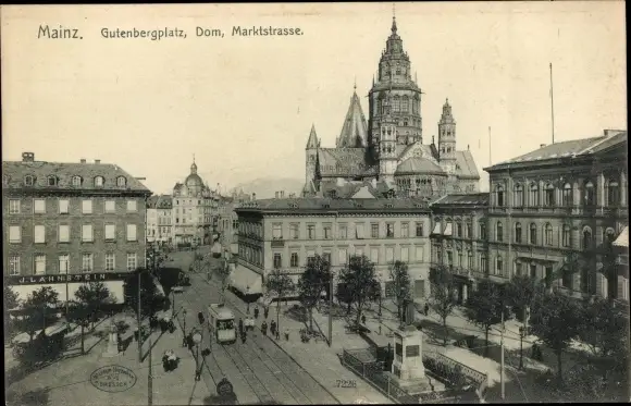 Ak Mainz am Rhein, Gutenbergplatz, Dom, Marktstraße, Straßenbahn, Denkmal