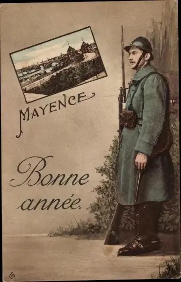 Ak Mainz am Rhein, Mayence, Soldat neben Stadtbild