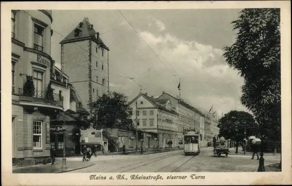 Ak Mainz am Rhein; Rheinstraße, eiserner Turm, Straßenbahn