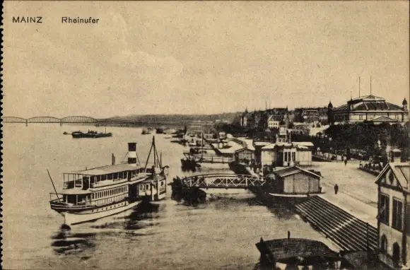 Ak Mainz am Rhein, Rheinufer, Anleger, Schiffe, Brücke