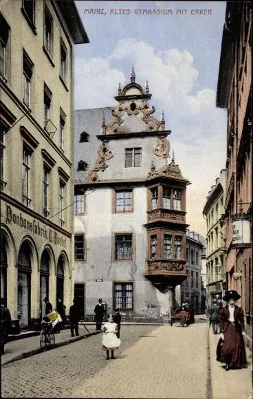 Ak Mainz am Rhein, Straßenpartie, altes Gymnasium mit Erker