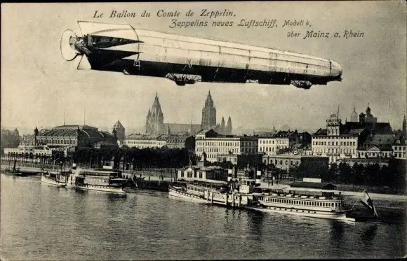 Ak Mainz am Rhein, Zeppelins neues Luftschiff Modell 4 über der Stadt, Salondampfer