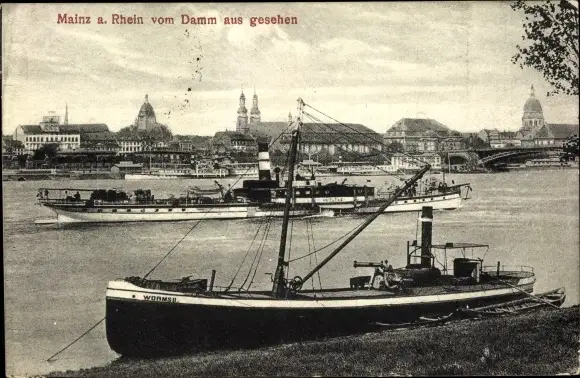 Ak Mainz am Rhein, vom Damm aus gesehen, Dampfer