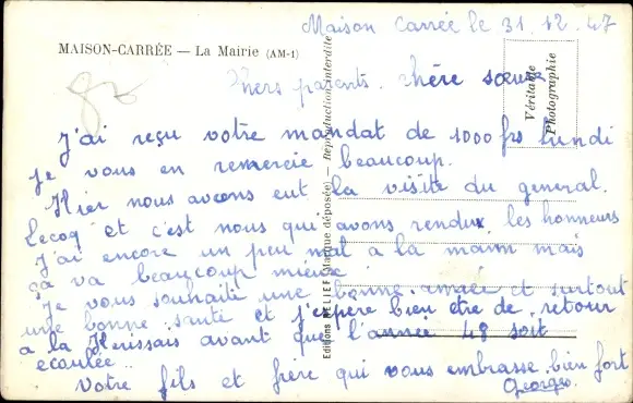 ungelaufen, datiert 1947, Rückseite beschrieben, leichte Knickspur rechts, sonst guter Zustand