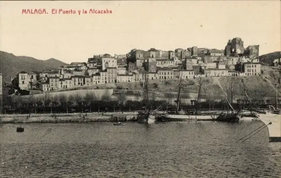 Ak Malaga Andalusien Spanien, Hafen und die Alcazaba