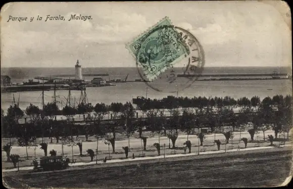 Ak Malaga Andalusien Spanien, Park und Laternenpfahl