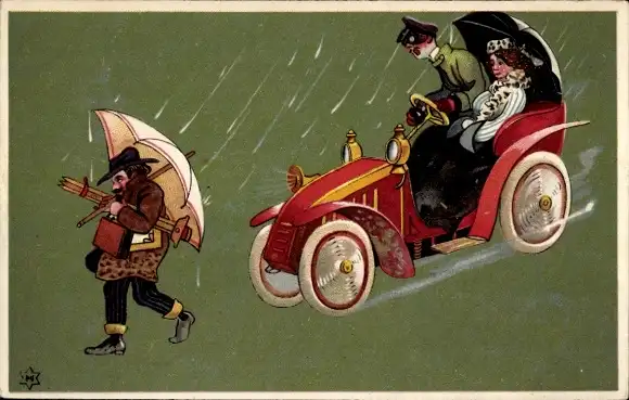 Ak Maler mit Staffelei im Regen, Auto fährt hinter ihm