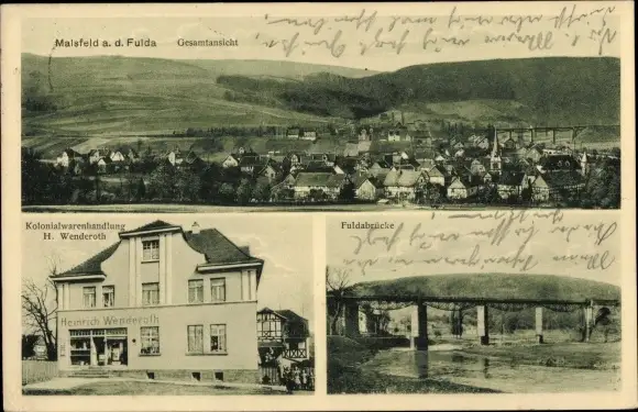 Ak Malsfeld in Hessen, Gesamtansicht, Kolonialwarenhandlung, Fuldabrücke