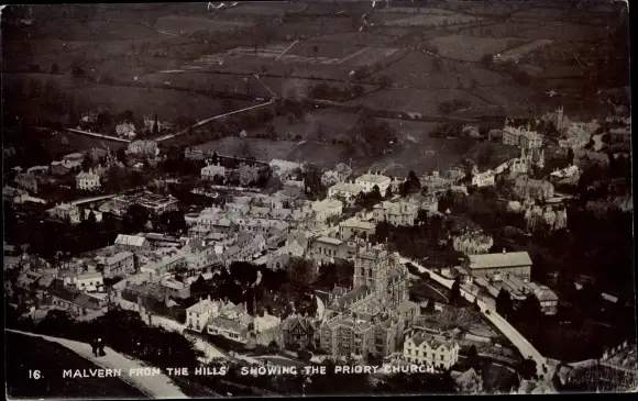 Ak Malvern West Midlands, View from the Hills showing Priory Church