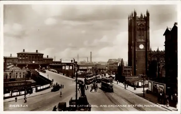 Ak Manchester England, Kathedrale, Austauschstation, historische Szene, Straßenbahn