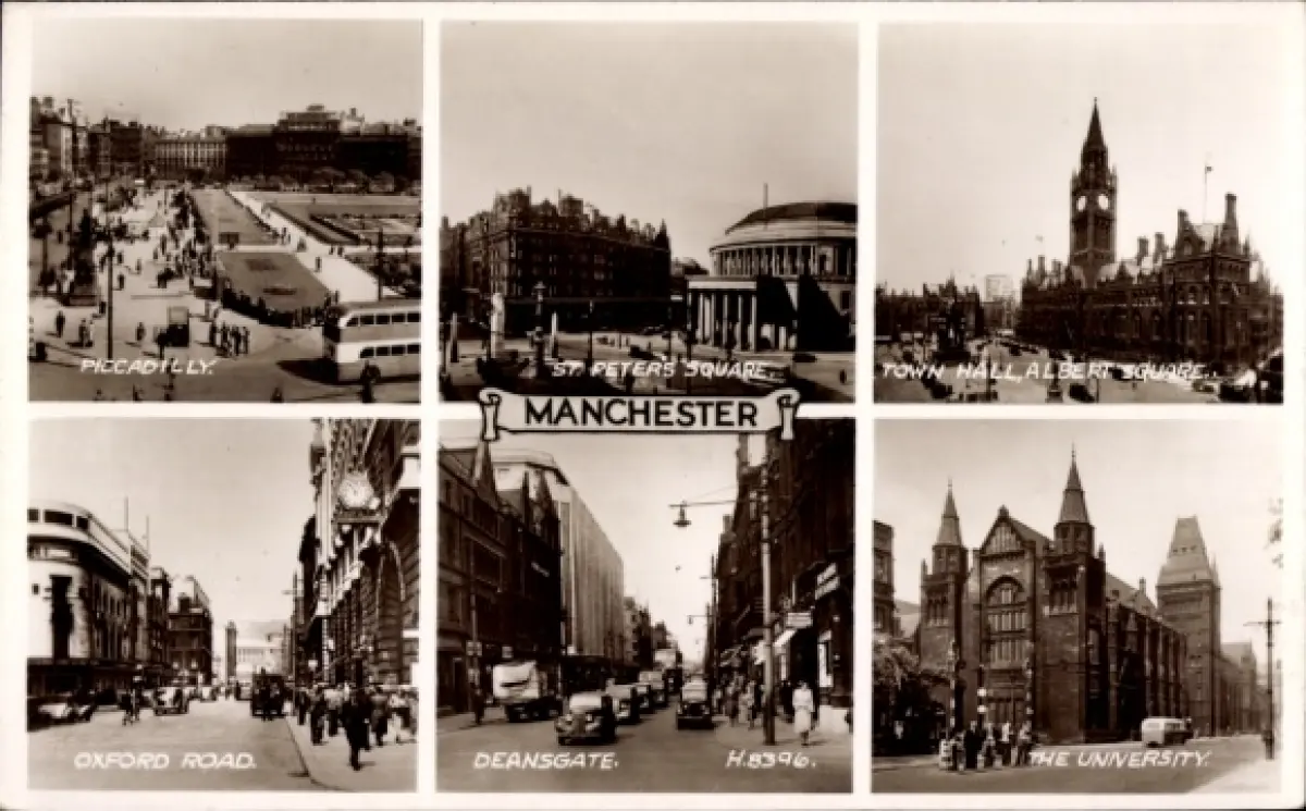Ak Manchester England, Piccadilly, St Peters Square, Town Hall, Oxford Road, Deansgate, The Unive