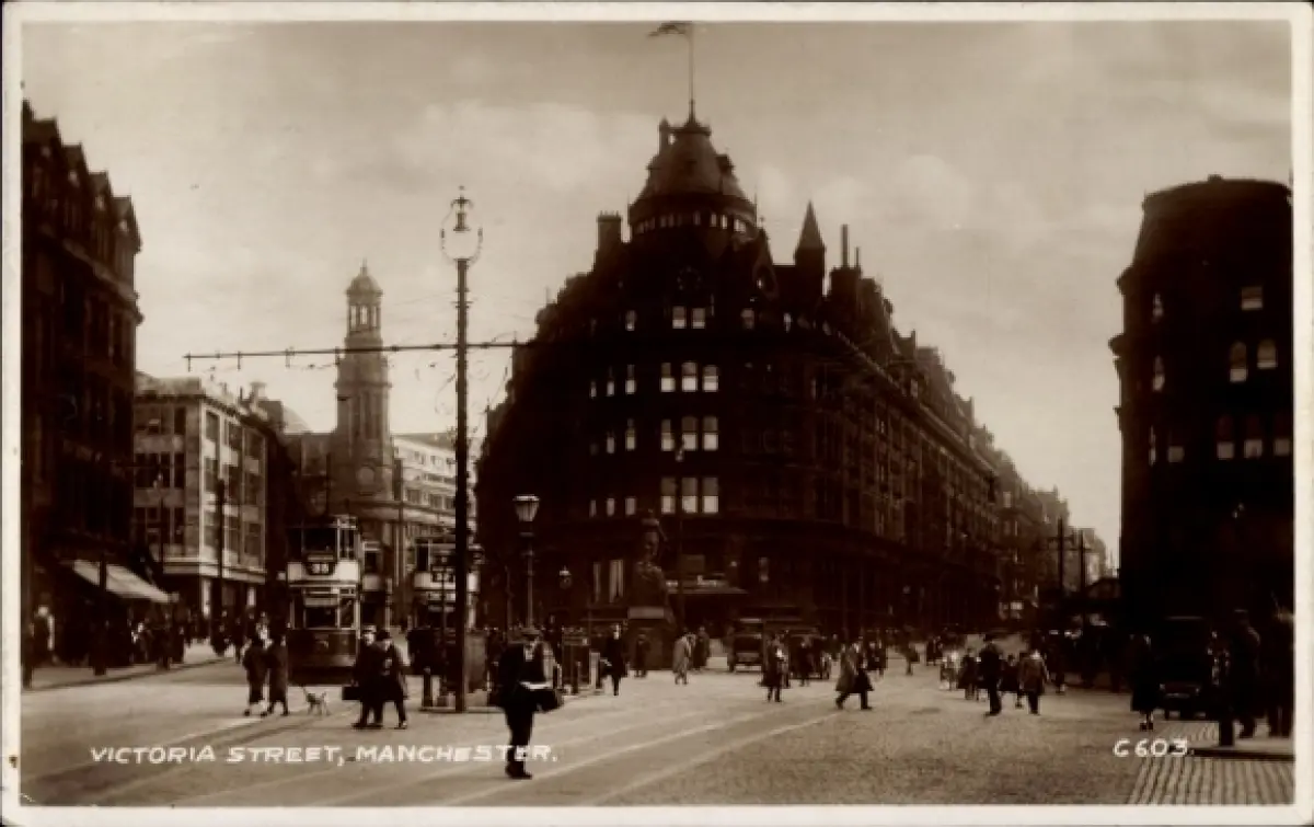 Ak Manchester England, Victoria Street, Architektur, Menschen, Straßenbahn