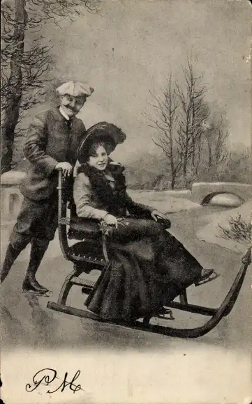 Ak Mann auf Schlittschuhen schiebt Schlitten mit einer Frau