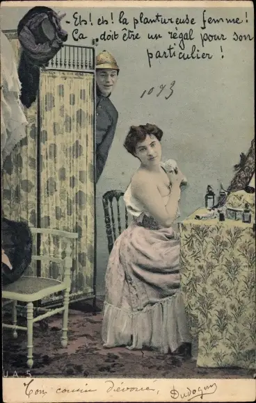 Ak Mann beobachtet Frau in Unterkleid