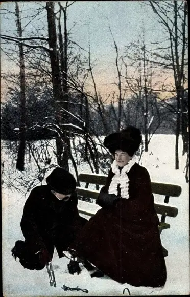 Ak Mann hilft Frau die Schlittschuhe anzuziehen