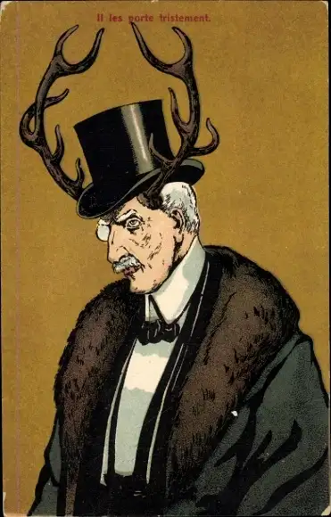 Ak Mann im Mantel mit Zylinder, Geweih, gehörnter Ehemann