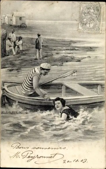 Ak Mann im Ruderboot, Frau im Wasser, Strandleben, Strandkorb