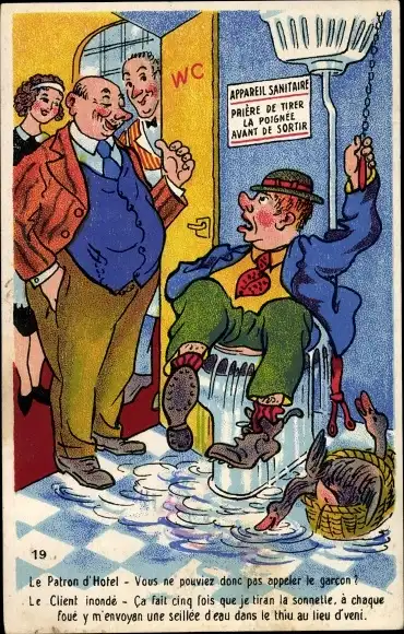 Ak Mann in der Toilette steckengeblieben, Überschwemmung, Ente, Zimmermädchen