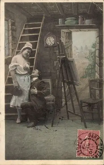 Ak Mann kniet vor einer Frau, Maler, Staffelei