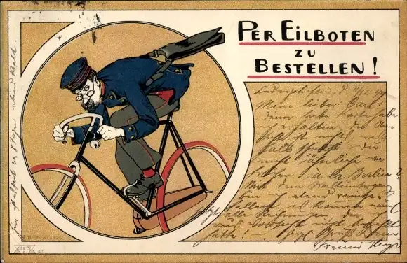 Ak Mann mit Fahrrad unterwegs, Per Eilboten zu bestellen