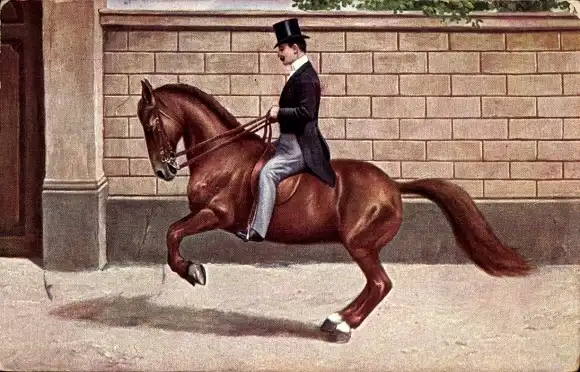 Ak Mann reitet auf braunem Pferd, Zylinder, Zaumzeug