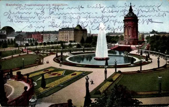 Ak Mannheim, Friedrichsplatz mit Wasserturm, Fontäne