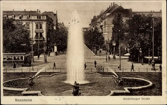 Ak Mannheim in Baden, Heidelberger Strasse, Springbrunnen, Straßenbahn