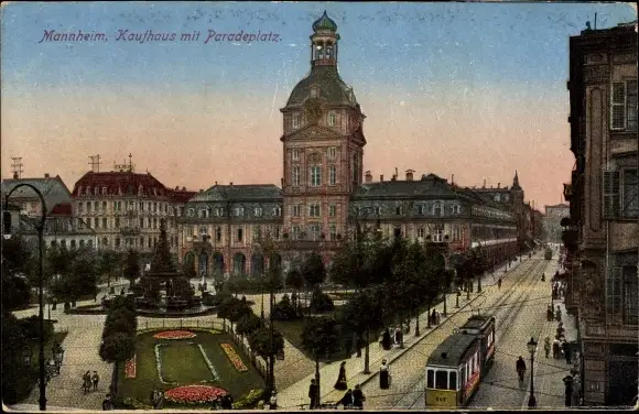 Ak Mannheim in Baden, Kaufhaus mit Paradeplatz, Straßenbahn, Parkanlage