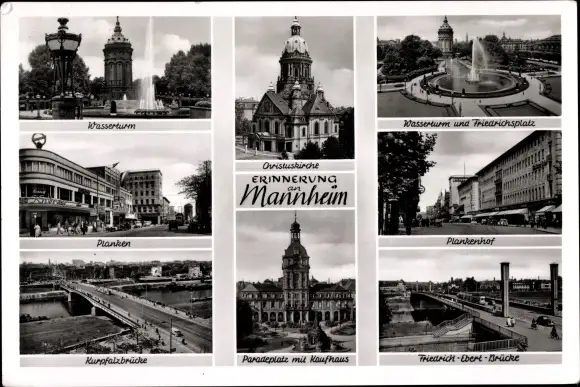 Ak Mannheim in Baden, Paradeplatz, Kaufhaus, Wasserturm, Kurpfalzbrücke, Christuskirche