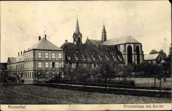 Ak Marienthal Kaltenhausen Elsaß Bas Rhin, Priesterhaus mit Kirche