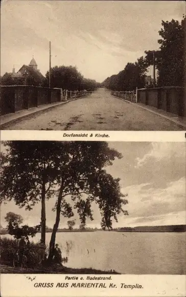 Ak Marienthal Zehdenick in der Mark, Straßenpartie, Kirche, Badestrand