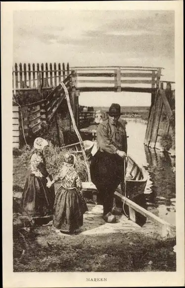 Ak Marken Nordholland Niederlande, Volkstrachten, Brücke, Boot