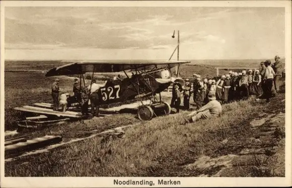Ak Marken Nordholland, Noodlanding, Notlandung auf einer Wiese, Flugzeug