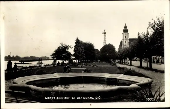 Ak Markt Aschach an der Donau in Oberösterreich, Gartenanlagen, Kirchturm, Brunnen