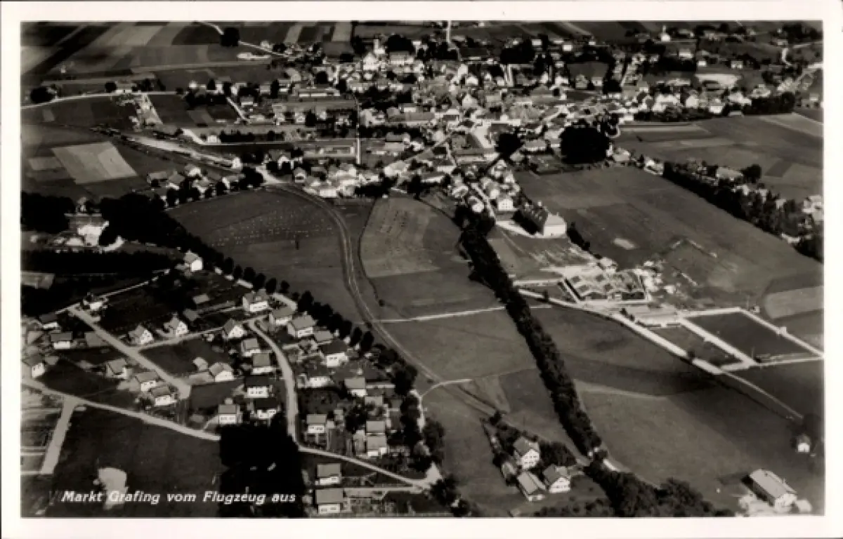 Ak Markt Grafing bei München Oberbayern, Luftaufnahme von Markt landschaftliche Ansicht, schwarz