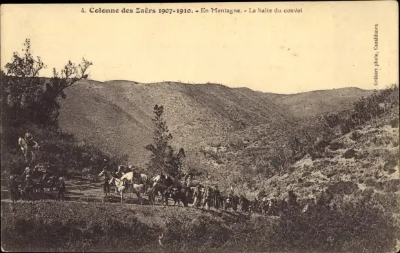 Ak Marokko, Colonne des Zaers 1907-1910, La halte du convoi