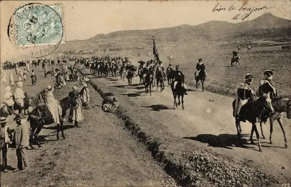 Ak Marokko, Defile d'un Goum, Krieger zu Pferden