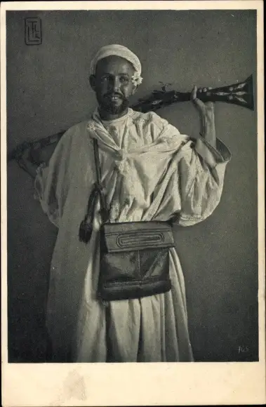 Ak Marokko, Mann in Gewand, Soldat, Gewehr, Blume, Tasche
